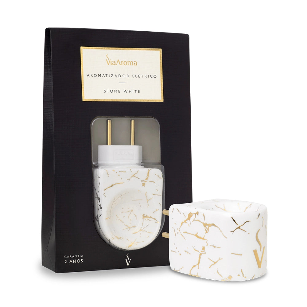 Nosso Aromatizador Elétrico Stone White confere um acabamento semelhante ao mármore, combinando elegância e funcionalidade. Possui design sofisticado, que adiciona um toque de classe à decoração do ambiente. O visual marmorizado com dourado traduz um aspecto luxuoso, o que torna o aromatizador não apenas uma ferramenta prática para espalhar fragrâncias, mas também um elemento decorativo único.